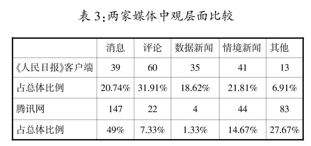 研究中,课题组将两大媒体的报道进行分类,最后得出消息、评论、数据新闻和情境新闻的数量和比例(见表3)。