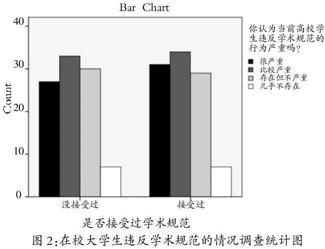 你认为当前高校学生违反学术规范的行为严重吗?在接受过此次学术规范教育的101人中有31人认为严重,34人认为比较严重,29人认为存在但不严重,7人认为几乎不存在;在没有接受过此次学术规范的97人中有27人认为很严重,33人认为比较严重,30人认为存在但不严重,7人认为几乎不存在。可见,无论有无接受学术规范教育,在校大学生大多意识到了高校存在学术失范现象,并且多数认为严重或者比较严重,因此加强学术规范教育有现实必要性。具体数据统计情况见图2:
