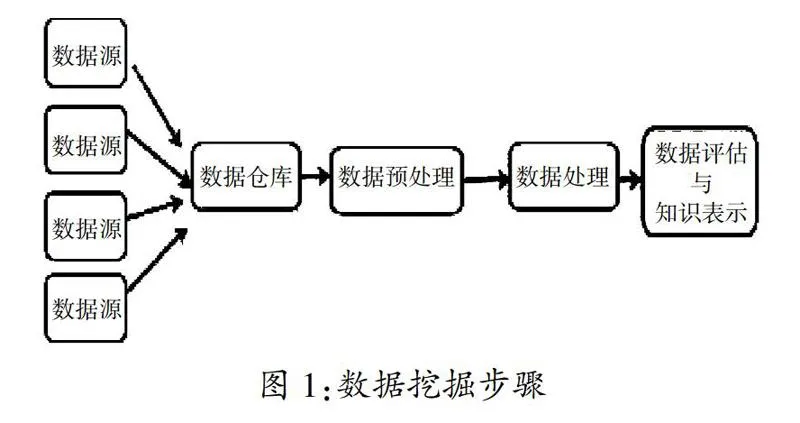 虽然,数据新闻已经在既往的实践中有了长足的发展,但数据挖掘(Data mining)不足仍然是数据新闻发展必须面对的主要问题。数据挖掘指的是对数据库中的数据进行探索的一个过程,是在海量数据中挖掘有效数据的重要技术。一般而言,数据挖掘在概念的层面分为三个阶段:数据源数据的收集、对于数据源数据的处理以及最终的有效数据的表示。如图1所示,数据挖掘主要通过四个步骤实现:源数据的收集阶段、数据预处理阶段、数据处理阶段、数据评估以及知识表示阶段[1]。具体来说,数据挖掘不足可以体现在以下三个方面:数据收集来源单一、数据处理能力有限和数据可视化表达程度有限。