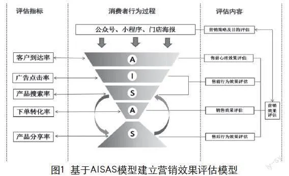 现根据互联网用户消费行为模型——AISAS的五个阶段,分别构建顾客转化率模型,对每个营销阶段的营销效果进行评价,从而实现精准营销。以到达率作为测量注意(A)阶段的测量指标进行售前心理效果评估;以广告点击率作为兴趣(I)阶段的测量指标;以产品搜索率作为搜索阶段的策略指标,兴趣阶段和搜索阶段共同进行售前行为评估;以下单转化率作为行动(A)阶段的策略指标来进行销售效果评估;以产品分享率作为分享(S)阶段的测量指标来进行售后效果评估,如图1所示。