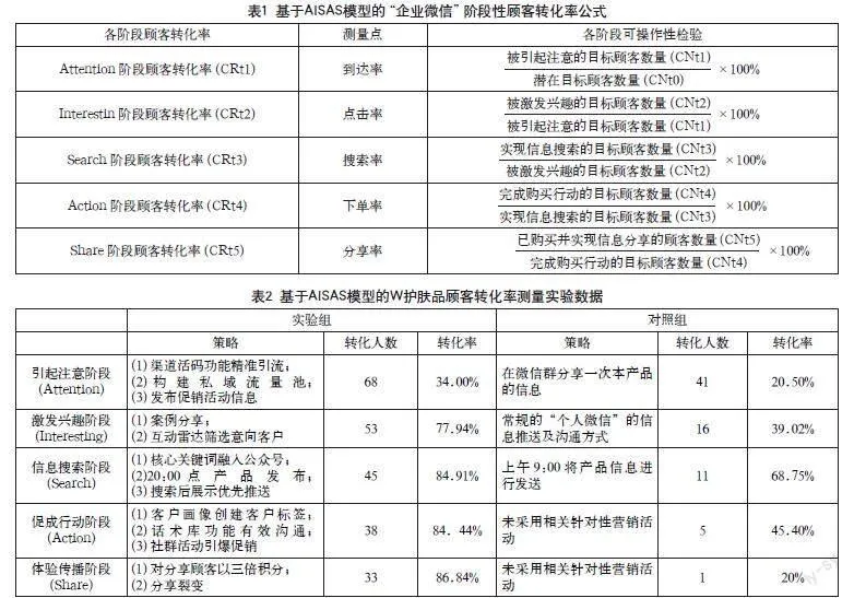本文选取该品牌的一款新面膜产品,实验组采用基于AISAS模型的五个阶段针对性营销活动的“企业微信”营销推广方式,而对照组采用仅在微信群进行软文推送的“个人微信”营销推广方式。实验组及对照组在五个阶段的相关营销策略及转化数据如表2所示。