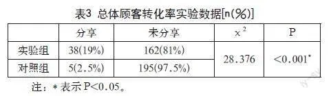 (1)总体营销效果评价。采用基于“企业微信”针对性营销活动的实验组最终形成购买的比例为:38/200=19%,而采用基于“个人微信”普通的微信朋友圈图片和软文推送的对照组最终形成购买的比例为:5/200=2.5%。经统计检验,P<0.05,差异具有统计学意义,可见采用符合AISAS模型各个阶段进行“企业微信”营销推广的实验组的总体营销效果明显优于对照组,如表3所示。