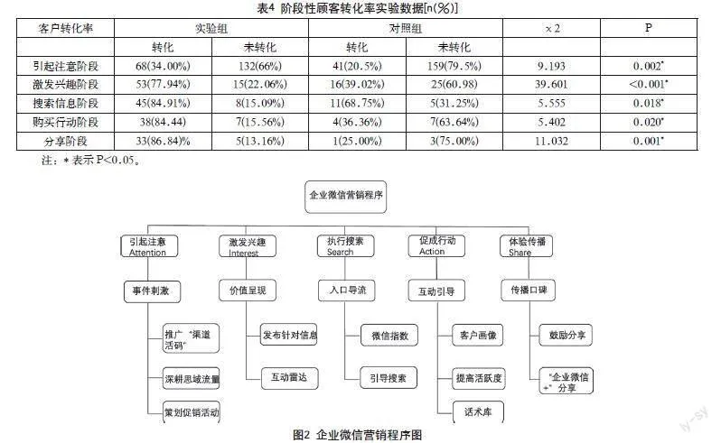 (2)各个营销阶段的营销效果评价。本文基于AISAS模型的五个阶段分别建立相应的数量模型,并进行统计检验,各个阶段均P<0.05,差异具有统计学意义。通过以上实验数据可以得出以下结论:(1)采用“企业微信”针对性营销活动的实验组各个阶段的营销效果均明显优于采用“个人微信”进行营销的对照组;(2)企业在对照组的微信营销过程中基于AISAS模型的相关营销策略的有效性如表4所示。
