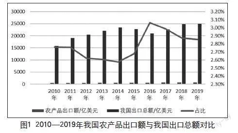 出口是农产品的重要流向。如图1所示,我国农产品出口额大致呈逐年递增趋势,但占出口总额的比重有较大波动,主要趋势为由2010年的2.76%下降到2014年的2.58%、由2016的3.06%下降到2019年的2.85%,说明我国农产品出口额的增速低于其他产品出口额的增速。