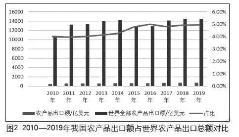 我国农产品出口额占世界全部农产品出口额的比重稳中有升,如图2所示,说明我国农产品在国际市场上的竞争力不断提高。