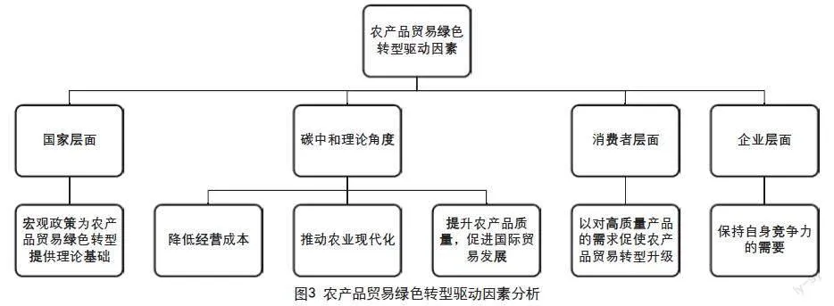 摘 要:我国于2020年提出双碳目标、2022年提出推进农业绿色转型。在此背景下,反观农产品国际贸易不难发现,在农产品贸易中仍然存在诸如出口产品缺乏竞争优势、农业企业技术水平低、难以突破绿色壁垒、出口环境不断恶化等问题。为实现农业碳中和与农业绿色转型、解决农产品贸易绿色转型,本文以碳中和理论为背景,分析农产品出口贸易现状、存在问题与转型驱动因素,并利用层次分析法,从政府部门、从业者、消费者三个维度构建指标体系,提出促进农产品贸易绿色转型的具体措施,以供参考。
