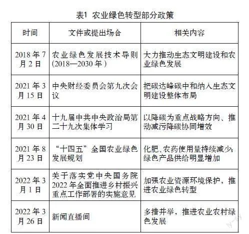 2021年3月15日,习近平总书记主持召开中央财经委员会第九次会议,强调推动平台经济规范健康持续发展,把碳达峰碳中和纳入生态文明建设整体布局[6]。2021年4月30日,习近平总书记在十九届中共中央政治局第二十九次集体学习时强调,“十四五”时期,我国生态文明建设进入了以降碳为重点战略方向、推动减污降碳协同增效、促进经济社会发展全面绿色转型、实现生态环境质量改善由量变到质变的关键时期[7]。2022年3月1日,农业农村部在《关于落实党中央国务院2022年全面推进乡村振兴重点工作部署的实施意见》中提出加强农业资源环境保护,推进农业绿色转型。农业绿色转型部分政策如表1所示。