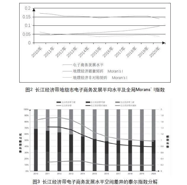 尽管先前研究在电子商务方面取得了显著进展,但多数学者在研究时样本较为局限,多为针对某一特定年份或是某一省份进行研究,关于长江经济带的研究仍相对有限。考虑到长江经济带覆盖了中国东中西部的重要区域,占全国面积的21.4%、人口和生产总值超40%,研究其电子商务发展现状对国家战略具有重要意义。因此,本文基于2010—2020年的数据,采用地理经济嵌套矩阵和地理经济非对称矩阵,利用熵值法、空间性研究、泰尔指数、空间杜宾模型从全局空间、区域空间、局部空间多层次研究长江经济带地级市电子商务发展水平,阐明长江经济带电子商务发展水平的空间分布格局和影响机制,从而为推动长江经济带电子商务发展实现共同富裕提供理论支撑和实践参考。