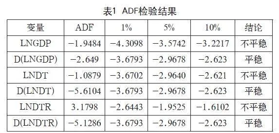 在研究时间跨度较长的时间序列时,为了防止研究结果出现“伪回归”现象,会对数据进行平稳性检验[14]。因此,本文采用ADF单位根检验法,对LNGDP、LNDT、LNDTR及其一阶差分数据D(LNGDP)、D(LNDT)、D(LNDTR)进行平稳性检验,结果如表1所示。