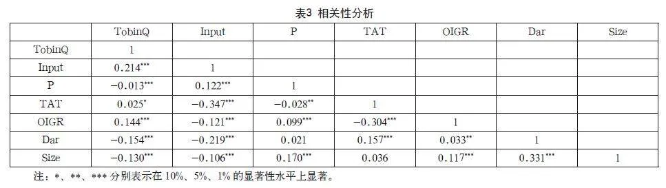 如表3所示,根据此次研究的主要被解释与解释变量的相关性分析结果可知,研发投入强度(Input)和申请专利数量(P)与企业绩效(TobinQ)之间均存在显著相关性。另外,各自变量之间的线性关系较弱,相关系数较小,说明这些自变量受其他因素的影响较小,不存在多重共线性。
