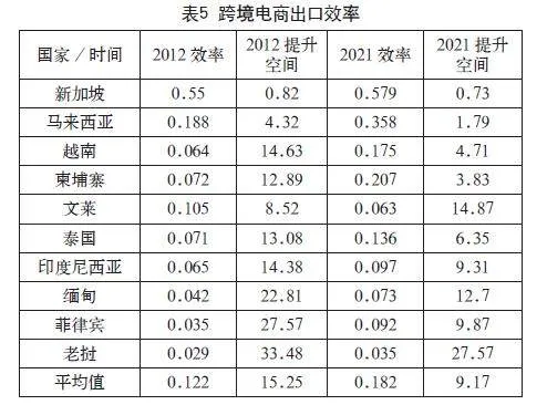 本文选取2012年和2021两年数据进行对比,从时间序列来看,2012年中国对东盟国家跨境电商出口平均效率为0.122,2021年的效率提高为0.182,表明这些年中国的“一带一路”与中国-东盟自贸区的建设取得了巨大的成果。从国家角度来看,对新加坡跨境电商出口效率最高,对老挝出口效率最低,对中高收入国家的出口效率普遍比中低收入国家更高。