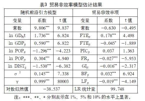 贸易非效率模型是在随机前沿引力模型的基础上,研究人为因素的影响,采用的解释变量有:通信发展水平(FTEit、FTEjt)、中国生产能力指数(PICit)、贸易国自由度(PICjt、FRjt、GIjt、BFjt)
