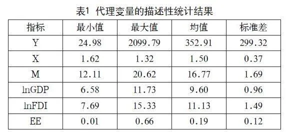 根据作为市场风向标的某些金融变量的重要程度和数据可得性,本文选择经济发展水平、外商直接投资和能源利用效率作为控制变量。(1)选取GDP的对数值表征我国经济发展水平,环境库兹涅茨曲线(EKC)假说认为碳排放与经济增长之间呈现倒U型关系,具体表现为碳排放量在经济稳定增长的初期阶段会有所增加,但在经济增长水平超过一定的范围后反而有所下降。(2)选取FDI的对数值表征我国外商投资强度,FDI的影响和规模随着贸易全球化的不断推进越来越显著,国家为吸引外资从而降低外国企业的环保标准,导致外国企业生产时倾向于利用当地的资源和廉价劳动力,而不是在技术设备的更新升级上加大投入,从而增加了当地的碳排放量。(3)选取能源消费强度的对数值表征我国能源利用效率EE,能源消费强度表示单个国家或行业在一定时间内生产单位产品所消耗能源数量,数值上等于各省份能源消费总量与各省份GDP的比值,并对碳排放水平有正向影响。各变量的描述性统计如表1所示。
