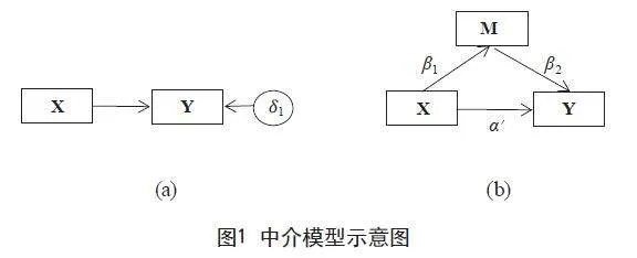 如果自变量X通过影响第三个变量M来影响因变量Y,则M是中介变量,它代表一种机制,X通过它影响Y。中介模型可以用图1来描述变量间的关系: