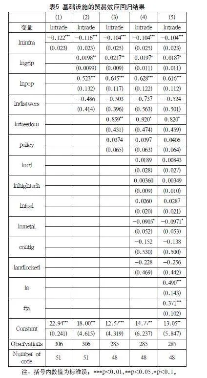 表5展示了基础设施的贸易效应回归结果。模型1仅加入了核心变量,即基础设施(infra);模型2逐步加入传统贸易模型中的指标,即经济发展水平(gdp)、人口规模(pop)和距离(distwces);模型3加入了经济自由度(freedom)和制度指标(policy);模型4加入了技术、要素和地理位置指标;模型5加入了两个虚拟变量。