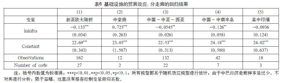 总体来看,在六大经济走廊地区,基础设施指数与贸易和投资均呈负相关,即基础设施的改善并不能显著促进中国与这些国家的双边贸易和投资。具体来看,就贸易效应而言,仅有中蒙俄地区的基础设施改善能显著促进双边贸易,而新亚欧桥、中国—中亚—西亚和中国—中南半岛的基础设施指数均与双边贸易呈负相关;就投资效应而言,仅有新亚欧大陆桥、中蒙俄和中南半岛表现为显著的负相关。