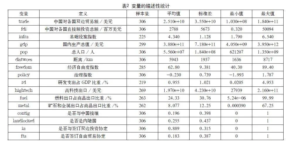 2.2.3 控制变量:参考已有研究,本文选取如下控制变量:(1)规模:东道国的国内生产总值和人口通常被视为外国直接投资流动和贸易的重要决定因素[25-26]。本文选择东道国GDP(gdp)和人口(pop)作为经济发展水平和人口规模的测度;(2)距离:本文选择中国对沿线国家的距离(distwces)来测度;(3)经济自由度:正如张鹏飞(2018)所述,国家经济体制机制越健全,经济自由度越高,将会提升贸易便利化水平,有效降低贸易成本[27]。作为影响因素之一,本文将该因素(freedom)作为控制变量纳入模型。经济自由度指数涵盖12个方面的内容,每个指标的取值范围为0~100,数值越大,代表一国的经济自由度越高;(4)制度质量:参考一些学者[24, 28, 29],本文选择全球治理指数来反映国家制度对外资和双边贸易的影响。全球治理指数包括六个方面,分别是话语权和责任、政治稳定性和不存在暴力、政府效率、管理治理、法治和腐败控制,各个指标的取值范围为-2.5到2.5,数值越大,代表政府治理水平越好。本文选取这六项的平均值(policy)代表国家治理水平;(5)技术水平:考虑到技术水平的影响,本文选择高科技出口(hightech)和研发支出占GDP比重(rd)来测度其对我国对外投资和双边贸易的影响;(6)要素投入:参考Liu等(2017) [10]和Buckley等(2007)[25],本文选择东道国矿石和金属出口占总出口比重(metal)、燃料出口占总出口比重(fuel)来测度东道国的自然资源禀赋;(7)其他虚拟变量:本文加入是否签订双边自由贸易协定(fta)、是否签订投资保护协定(ia)、是否为内陆国(landlocked)、是否与中国接壤(contig)作为控制变量以确保模型回归结果的准确性。各变量描述性统计如表2所示。