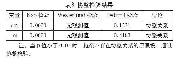 表3显示,扩展边际em和集约边际im均通过了Kao检验,p值为0;在Westerlund检验中em与im均无观测值;在Pedroni检验中,两者p值均大于0.01未通过检验。Kao检验为同质面板检验,Westerlund与Pedroni为异质面板检验,因数据为非平衡面板数据,通过同质面板检验,即通过协整检验。