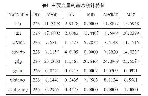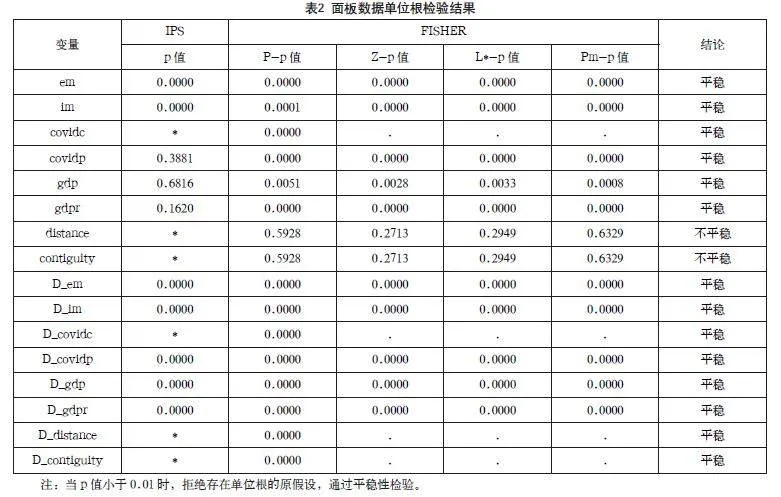 由表2 IPS检验结果可知,在1%的显著性水平下,em、im均通过检验;covidp、gdp、gdpr的p值大于0.01未通过检验;而distance、contiguity因无法观测而未通过检验。但在FISHER检验中,在1%的显著性水平下,em、im、covidc、covidp、gdp、gdpr均通过检验;distance、contiguity因p值大于0.01未通过检验。经过一阶差分后,em、im、covidc、covidp、gdp、gdpr、distance、contiguity均通过检验。