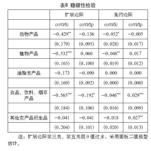 如表8所示,中国疫情的爆发对于第一类动物产品,第二类植物产品,第四类食品、饮料、烟草产品扩展边际和集约边际均具有显著的负向影响,而伙伴国疫情的爆发对于第四类食品、饮料、烟草产品和第五类农产品其他衍生品集约边际具有显著正向影响,对于第四类产品扩展边际为负向影响,以上两点结论均与基准回归结论一致。