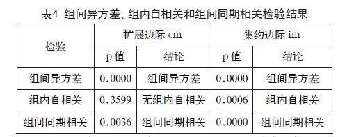 如表4所示,扩展边际em是组间异方差、组间同期相关的,而集约边际im是组间异方差、组内自相关、组间同期相关的。在进行基准回归时要对以上扰动项特征进行区别。