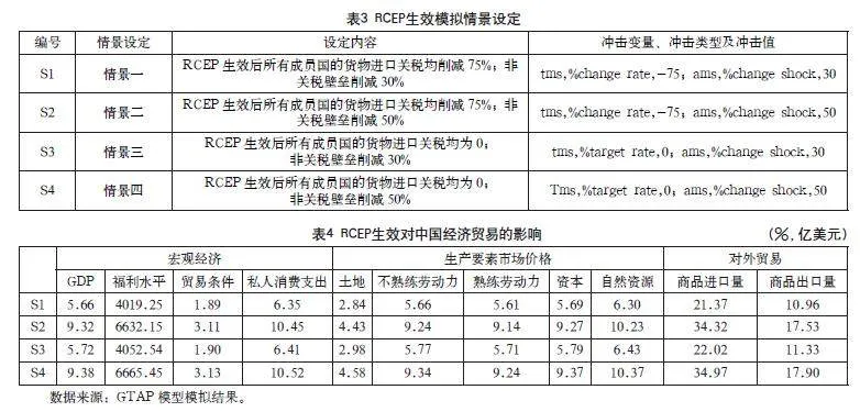 因此,本文将关税削减和非关税削减作为研究主题的冲击变量,并设置不同的关税削减程度及非关税壁垒削减幅度作为对照情景,以评估RCEP生效后对中国宏观经济及农产品的影响,具体冲击方案情景如表3所示。