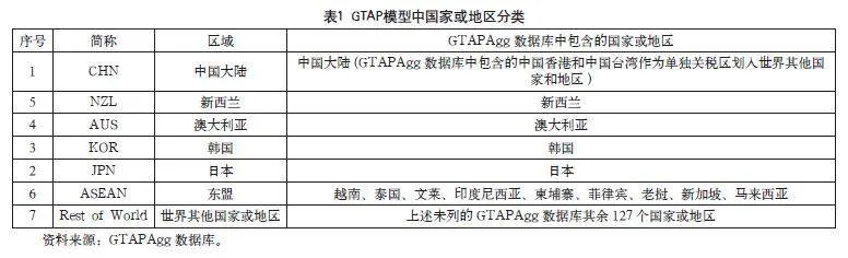 本文将GTAPAgg数据库中的141个国家或地区重新聚集成中国大陆、新西兰、澳大利亚、韩国、日本、东盟及世界其他国家或地区共7个区域,具体分类如表1所示。