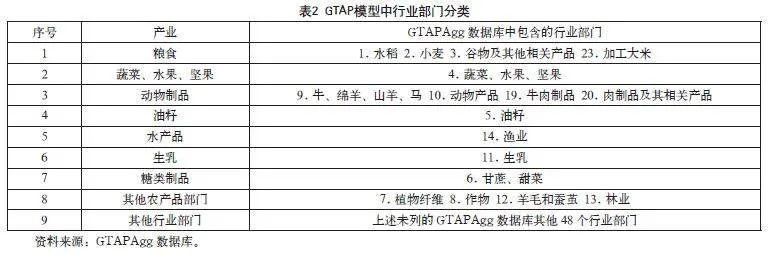 在农产品聚集分类时,本文以我国颁布的《中华人民共和国农产品质量安全法》规定的农产品定义作为分类标准,将GTAPAgg数据库中的65个行业部门涉及的农产品重新聚集为粮食、蔬菜、水果和坚果、动物制品、油籽、水产品、生乳、糖类制品及其他农产品部门,同时把其余的行业部门划入其他行业部门,具体分类如表2所示。