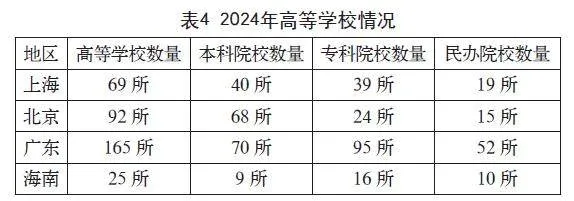 海南省的高校数量相对较少仅25所(数据截至2024年10月),仅多于西藏、青海和宁夏三省区,2024年海南省的高校毕业生规模仅为8万人。值得注意的是,海南本地就业机会有限,一部分本科和硕士毕业生因此并未选择留在海南就业,而是前往其他地区寻求发展。此外,许多海南籍的学生在外地求学后,也未能顺利返回海南工作,进一步加剧了海南的人才流失问题。数据显示,高职院校毕业生比本科和硕士毕业生留在海南的就业率较高,这也从一定层面反映出海南在吸引和留住高端人才方面仍面临挑战。