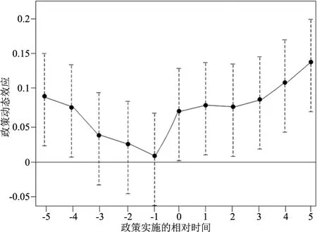 平行趋势检验要求在政策实施前,试点城市与非试点城市的企业突破性绿色技术创新发展趋势应处于平行状态。由此,本文使用事件研究法进行平行趋势检验,以低碳试点政策第一次实施时间2010 年作为分割点,将样本划分为政策实施前5 年与后5 年两部分,共10 年的窗口期,并以低碳试点政策实施前第6 期数据为基期,检验结果如图1 所示。不难看出,在低碳试点政策实施前,政策虚拟变量各期估计系数均不显着,证实试点与非试点城市在政策实施前符合平行趋势检验要求。此外,就试点政策动态效应而言,在低碳试点政策开始实施当年,企业突破性绿色技术创新所受驱动效应不显着。随时间推移,试点组城市的企业突破性绿色技术创新水平整体呈上升趋势,表明政策促进效应具有一定的时滞性与动态可持续性,证明研究样本通过了平行趋势检验。