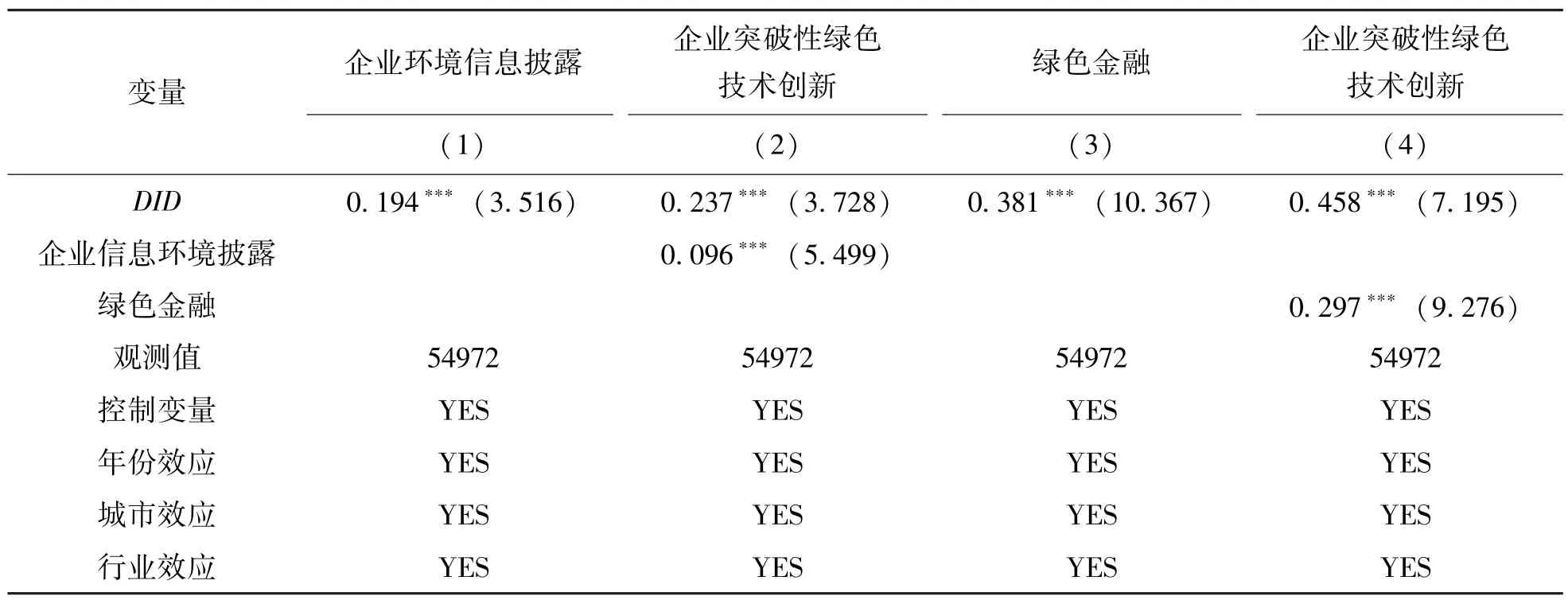 3.3 机制检验基于前文理论分析,低碳试点政策可能会通过企业环境信息披露与绿色金融两条路径对企业突破性绿色技术创新产生影响。针对企业环境信息披露,参考肖仁桥等[23]的研究,(1) 根据2005 ~2022 年《企业社会责任报告与环境责任报告》 (对个别企业缺失数据采用同一企业其他年份相应数据平均值代替)获取词频数据; (2) 利用Python 进行分析,将报告中披露项目的企业指标取值为1,反之为0; (3) 通过加总环境披露项目词频指数取得企业环境责任得分,以衡量企业环境信息披露。对于绿色金融水平的测度,借鉴孙英杰和林春[24]的研究方法,选取绿色证券、绿色信贷、绿色保险、绿色投资4 个指标①,使用移动加权平均法进行综合测算。在此基础上,构建中介效应模型如下: