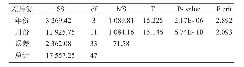 对非法运输木材案件的数量进行无重复双因素方差分析,结果(表4)显示,年份之间的案件数量和月份之间的案件数量存在显著差异。月份间案件数量差异显著,说明案发具有一定的季节性,个月之间有较大的不同;年案件数量差异显著,说明案发数量在年度之间没有关联,具有随机性。非法运输木材案件的发生时间分布与农闲、天气有关,1月、2月为春节期间,同时气温较低,人们较少从事生产活动,3~5月为尤溪县雨季,非法运输较为不便,所以案发数量较低。