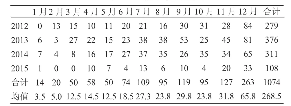 尤溪县在2012~2015年期间共发生非法运输木材案件1 074起(表3),占林木类案件总数的85.51%,是行政案件的主要类型,每年发生279~376起,每月发生14~263起,平均年发生268.5起,平均月发生22.4起。发生时间分布主要在每年的11月和12月。