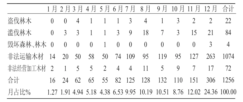 根据国家2016《林业行政案件类型规定》的新分类法,林木类行政案件包括“盗伐林木”、“滥伐林木”、“毁坏森林、林木”、“非法运输木材”、“非法经营加工木材”五大类。对2012~2015年4年间尤溪县林业行政案件中按五个林木类案件类型的数量分别年、月进行统计,分析其分布特征。采用2013Microsoft Excel进行描述性统计、方差分析。