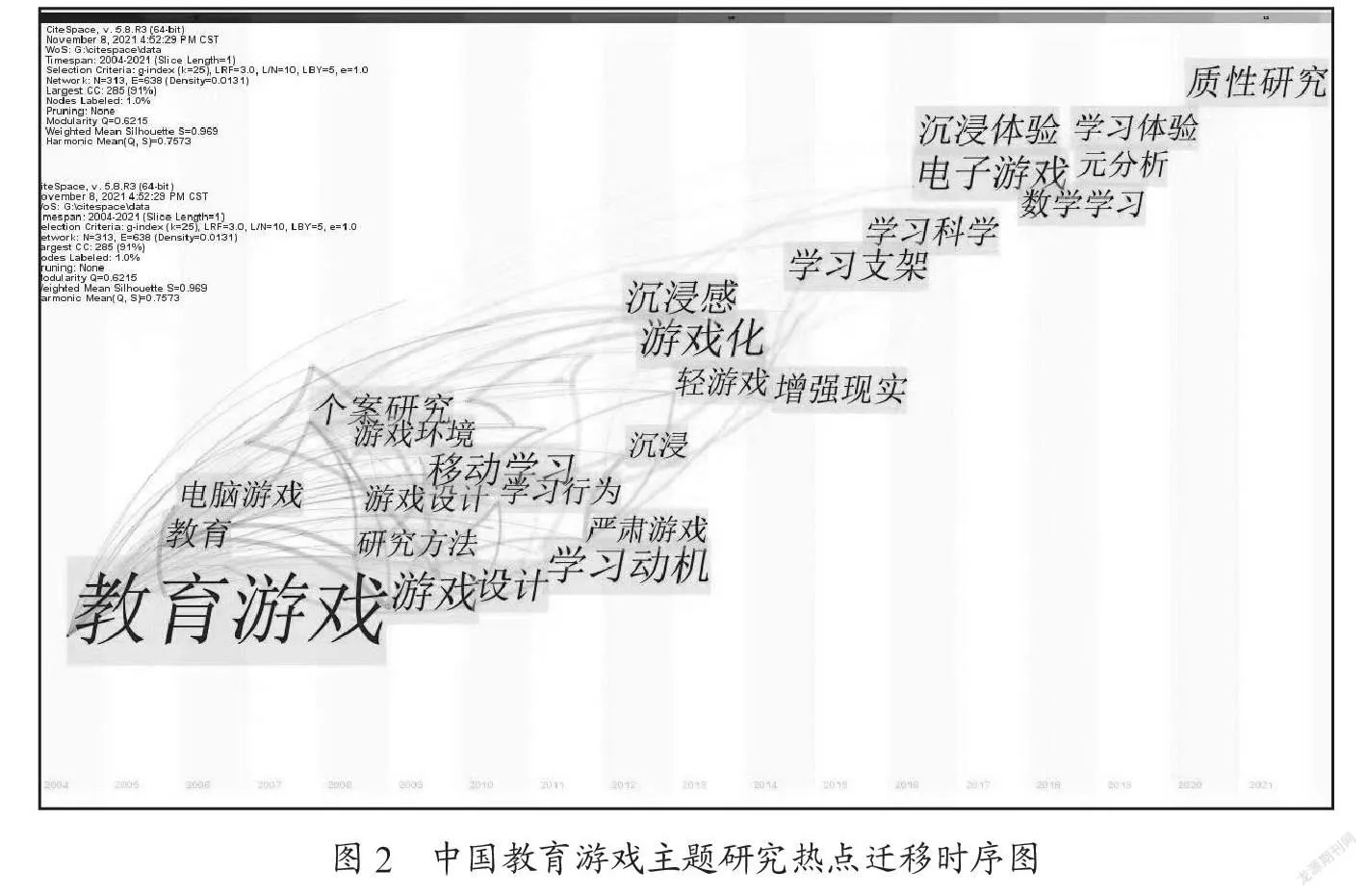利用软件CiteSpace生成Timezone视图,如图2所示。可知2008年后教育游戏出现了多个研究方向的扩充,“游戏设计”“游戏环境”等研究领域应运而生,各个方向趋于成熟更加注重对教育游戏的深化,而不仅在理念上停留,呈现出稳定性。到了2011年前后,人机交互逐渐显现出来,这一研究领域更加注重沉浸感,出现较多新型研究主题,发展体态较好的词频有“增强现实”“学习支架”及“学习科学”等相关术语,这些新的研究主题很有可能会成为未来新的研究热点。例如,基于教育游戏的沉浸体验;元分析在教育游戏中的运用;教育游戏在各个学科中的综合应用;游戏化学习体验的质性分析研究。近年来中国教育游戏可能会呈现两大研究趋势:基础理论走向多元化,相互研究和人类心理学联系更为紧密;教育游戏在学科实践中持续扩大,人工智能、大数据和教育游戏等元素结合的取向愈加明显。
