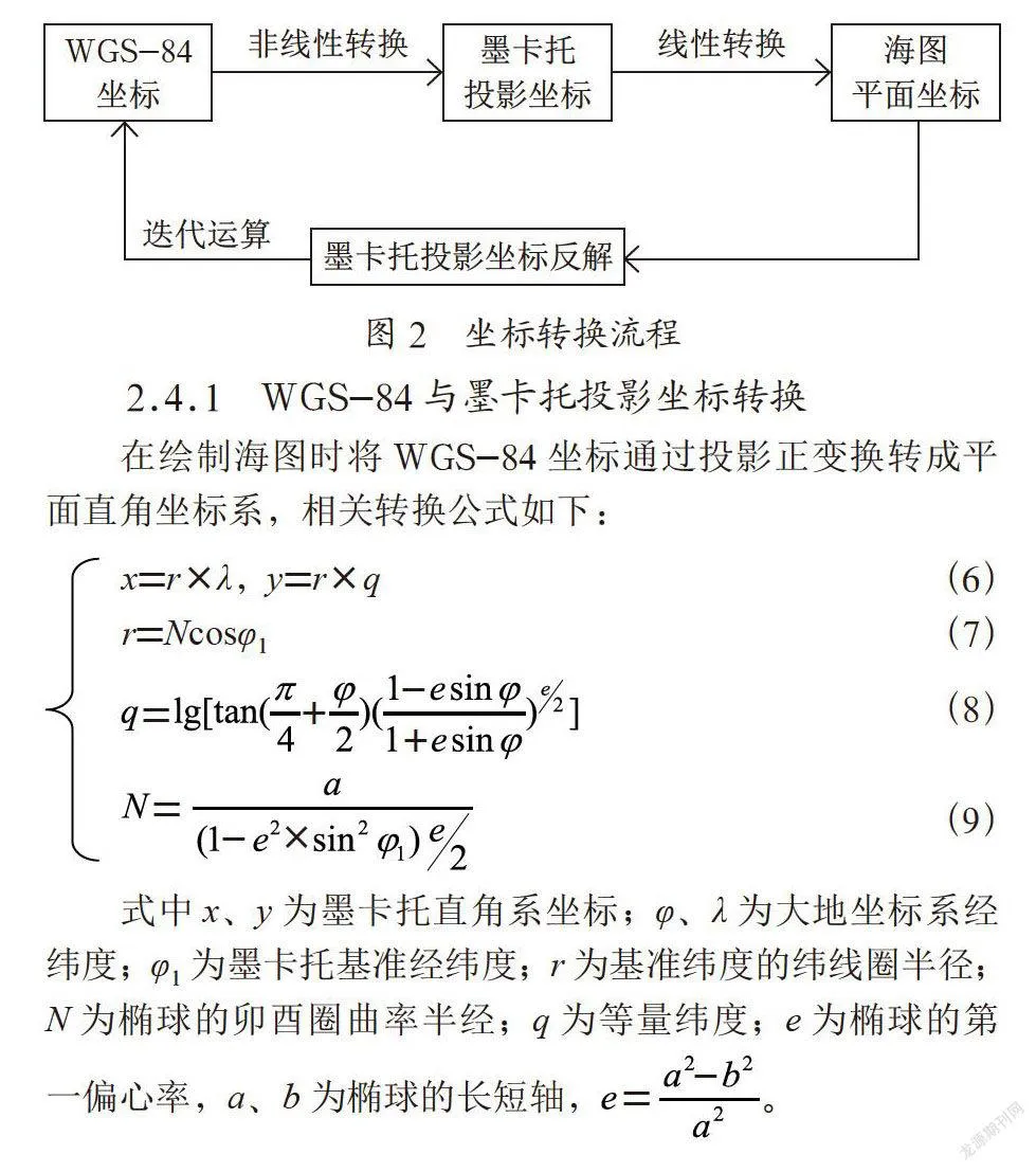 在绘制海图时将WGS-84坐标通过投影正变换转成平面直角坐标系,相关转换公式如下: