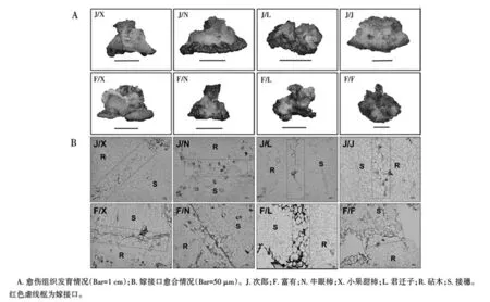 图3 不同砧穗组合愈伤组织靠接35天后的生长及接口组织状态[7]