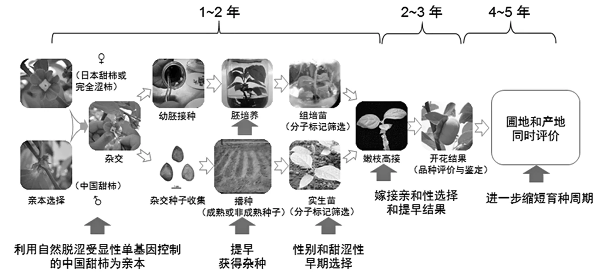 1.2 广亲和砧木筛选和繁殖将是柿产业重点关注的问题日本是世界上甜柿发展最早和遗传改良成就最大的国家[2]。目前世界范围内的甜柿主栽品种均源自日本,但日本甜柿的土壤适应性较差,尤其是部分优质品种,如富有、太秋等,与我国传统产区习惯采用的砧木君迁子(D.lotusL.;2n=2x=30)嫁接亲和性较差,尤其是日益严重的后期不亲和现象,已经成为柿产业面临的新问题。因此选育具自主知识产权的且与君迁子嫁接亲和的中国甜柿新品种是我国柿产业可持续发展的希望所在。华中农业大学利用相对独立起源的中、日两国原产甜柿种质互为亲本,将传统杂交与现代生物技术和分子标记辅助选择等技术环节有机整合,建立起甜柿高效遗传改良体系。该体系在扩大杂种优势和缩短育种周期的同时,可早期淘汰7/8非目标单株(图2)。该技术体系的进一步优化和应用,将在培育具自主知识产权的中国甜柿新品种中发挥重要作用[5]。