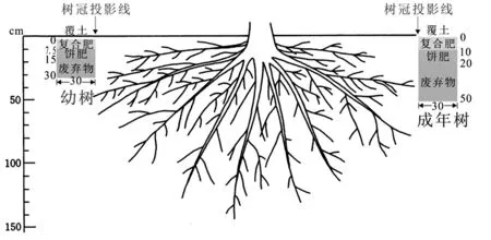 华中农业大学提出“以冬季管理为中心、以提高土壤有机质含量为重点”的田间管理模式和以“地钻分层辅助穴施冬肥”为中心的冬季柿园管理技术[14]。该技术体系集成“抽槽改土+起垄定植”、“宽行密株+树盘覆盖+行间生草”、“Y形整形+简化修剪”、“地钻辅助分层穴施冬肥”(果园生鲜废弃物粉碎后直接还田)、无损生理落果控制,果实留树保脆等环节,省工约50%、省肥约40%。在湖北建始和广西恭城的试验示范结果表明,该技术通过时间差(根系休眠期)和空间差(穴深50cm),可将未腐熟的果园废弃物(修剪后的枝条、落叶和杂草等)粉碎后直接还田(置于底层),并配合施用有机肥(饼肥等,置于中层)和速效氮肥(置于上层,调节碳氮比),施肥量占全年80%左右(图5)。此外,在采果前后施用一次“还阳肥”(礼肥),即可满足树体生长发育和产量品质的基本要求。这种局部施肥方式(成年树每树4穴,深度50cm、直径30cm)不仅节约肥料和劳力,且可抑制根系上浮,显着提升树体生理状态的稳定性和对非生物逆境的抵抗能力。