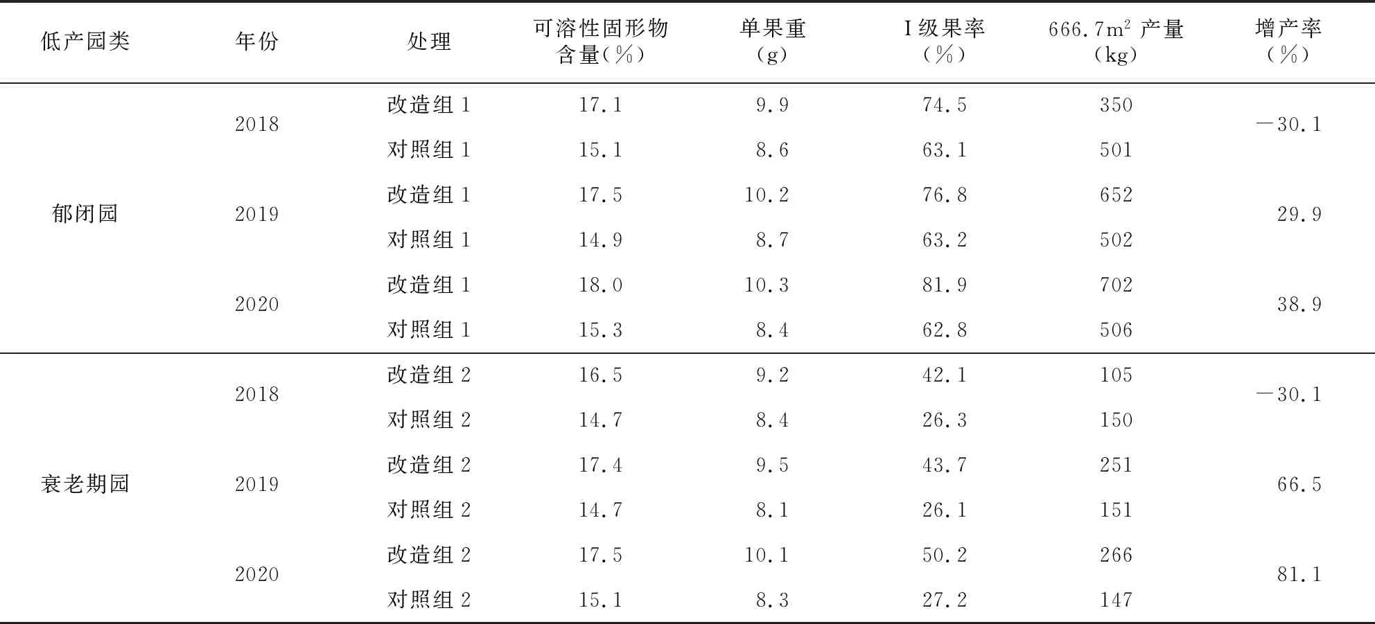 表3 甜樱桃低产园改造加配套技术的果实品质和产量比较