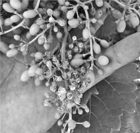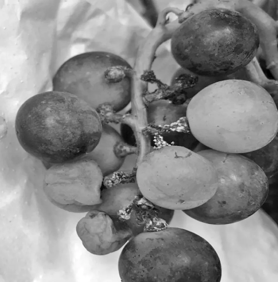 1 葡萄霜霉病发生症状葡萄霜霉病主要危害叶片,也危害新梢和幼果。幼嫩叶片较易侵染,被染病叶片出现油渍状小斑点,半透明,边缘不清晰,渐扩展为黄色至褐色多角形斑点,严重者会相互连片形成大斑(图1)。潮湿时,病斑背面产生白色霜状霉层,手擦不去(图2),与白粉病不同。新梢、二次梢、卷须、穗轴和叶柄染病,始亦为水渍状半透明油渍状斑点,后发展为微凹陷、黄色至褐色病斑,潮湿时亦生成白色霜状霉层(图3),病梢生长停滞、扭曲变形,甚至枯死[2]。幼果染病后褪绿,果实表面产生霜状霉层,果实停止发育,随即皱缩脱落(图4)。果粒半大时受害,呈褐色软腐状,渐凹陷干瘪,俗称为“鬼捏果”(图5),不久干缩早落。套袋葡萄在初着色期果实染病,果柄处有残留白色霜状物,受害果粒停止生长、不着色且逐渐干缩脱落(图6)。一般情况下,果实着色后不再受侵染。