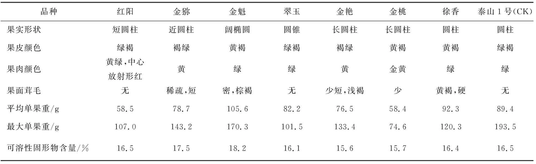 3.3 不同品种果实外观性状及内在品质从表3看出,果实形状、果皮颜色、果肉颜色、平均单果重、可溶性固形物等外观性状及内在品质方面,品种间表现明显不同。红阳突出的性状是果脐深凹,子房鲜红色,果肉含酸量低,风味香甜可口,可溶性固形物含量16.5%。金猕刚采摘时果肉绿黄色,放软后果肉金黄色,肉质细嫩、多汁,风味香甜爽口,可溶性固形物含量17.5%。金魁果个大,果肉绿色,汁液多,可溶性固形物含量高达18.2%,耐贮运、货架期长,部分果的果面有棱沟,少量果在髓心内出现空腔形成空心果。翠玉果实较大,呈灯笼状,底部似鸭嘴,风味浓郁可口,可溶性固形物含量16.1%,香气浓,耐贮藏。金艳果实呈长圆柱形,果点密生,果肩稍平,果肉黄色,口感偏酸,可溶性固形物含量15.6%。金桃果个较小,果肉金黄色,口感酸甜,可溶性固形物含量15.7%。徐香果面有黄褐色硬刺毛,果皮薄,易去皮,果肉绿色,酸甜适口,可溶性固形物含量16.4%,风味好。金魁、徐香果个大,平均单果重90 g以上,金猕、翠玉、金艳果个中等,平均单果重75~85 g,红阳、金桃果个较小,平均单果重分别为58.5 g和58.4 g。金猕、金魁可溶性固形物含量较高,17%以上,红阳、翠玉、徐香和泰山1号均在16.1%~16.5%,金艳、金桃较低,为15.6%、15.7%(图2)。