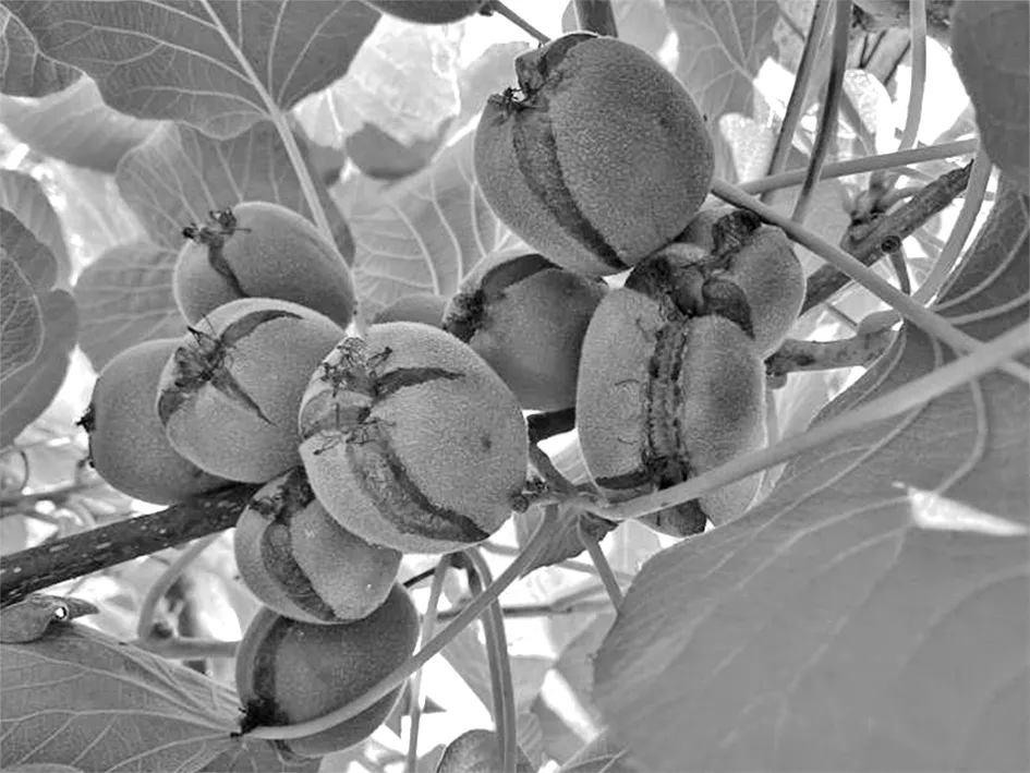 红阳在栽植1~2年、尚未形成良好叶幕期间,在5~6月气温高时,部分叶片出现边缘反卷、皱缩失绿等日灼症状,其他引进的6个品种无明显日灼症状出现。红阳可以在幼树期结合果园生草、合理灌水、科学夏剪等措施,减少夏季高温危害[5]。金猕在果实膨大期会出现裂果(图3)、成熟期落果现象。