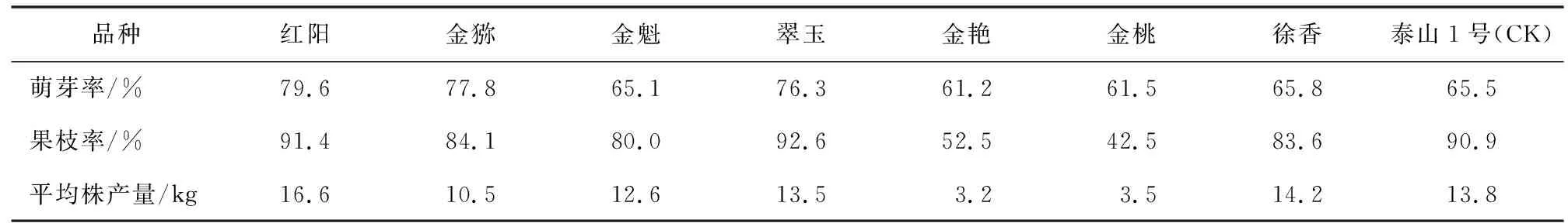 3.2 不同品种生长结果特性如表2,红阳、金猕、翠玉枝条萌芽率均在76%以上,萌芽抽枝力强,其他品种在66%以下。红阳、翠玉、泰山1号果枝率高,均在90%以上,说明这3个品种结果母枝抽生结果枝能力强;金猕、金魁、徐香果枝率较高,为80%以上;金艳、金桃果枝率中等。