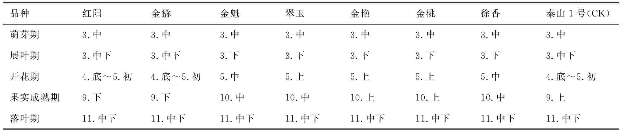 3 结果与分析3.1 不同品种物候期从表1看出,参试的8个猕猴桃品种的萌芽期均在3月中旬;红阳、金猕、泰山1号在3月中下旬展叶期,其余品种在3月下旬;红阳、金猕、泰山1号的花期在4月底5月初,翠玉、金艳、金桃在5月上旬,徐香、金魁在5月中旬,初花至末花持续10 d左右;泰山1号的果实成熟期在9月上旬,红阳、金猕在9月下旬,金艳、金桃在10月上旬,金魁、翠玉、徐香为10月中旬;各品种基本在11月中下旬开始落叶。