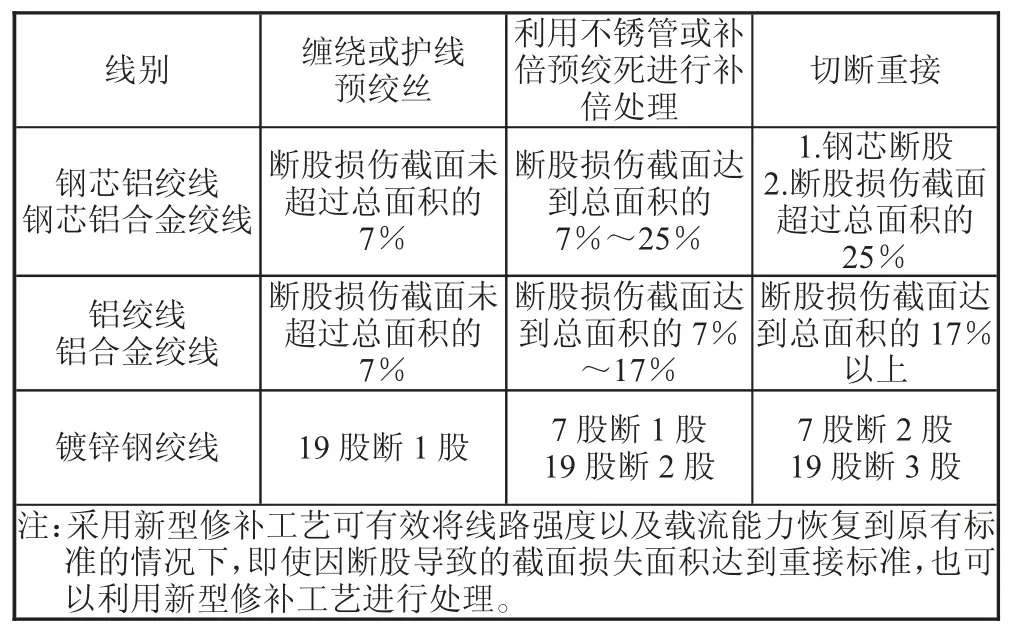 因断股、损伤导致导线及地线出现截面损伤的情况,依照如表2所示标准进行处理。