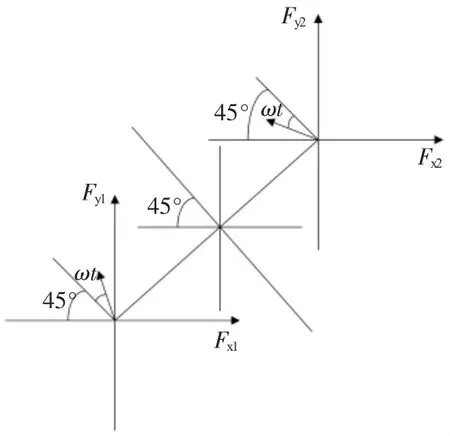 因此,由于激振器产生的各个坐标轴上的激振力是有时间差的,本文所考虑的香蕉型振动筛在谐响应分析中施加的载荷也必须要考虑相位角,否则将会影响计算结果的正确性。香蕉型振动筛的简谐激振力示意图如图2所示。
