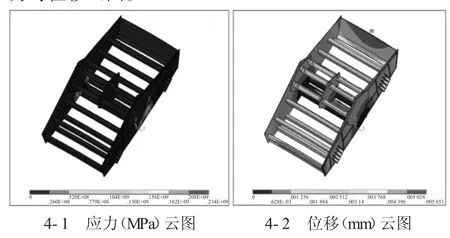从图3中可以看出,香蕉型振动筛结构出现最大位移的临界频率为26 Hz,最大位移为5.3 mm。因此,对频率为26 Hz的香蕉型振动筛结构的应力应变云图作进一步分析,可得到如图4所示的振动筛结构应力与位移云图。