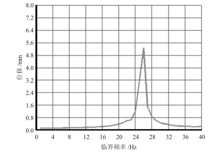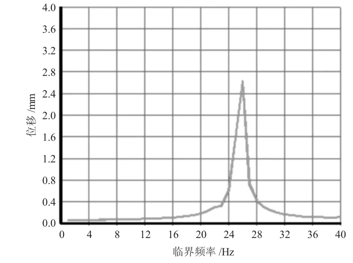 针对优化结构后的香蕉型振动筛再次进行谐响应分析,并对其进行频响特性曲线查看,如图6所示。从图6中可知,优化后的香蕉型振动筛在临界频率处的最大位移值明显下降,其数值为2.6 mm。