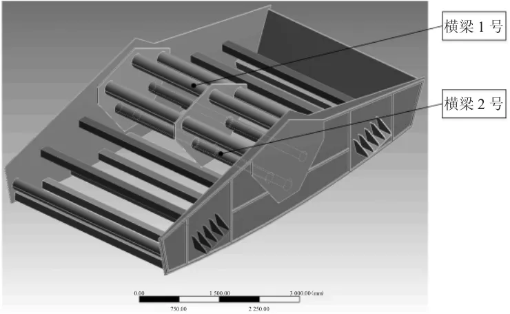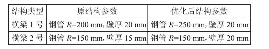 针对振动筛主梁横梁较为容易出现常见的断裂或开裂等现象,本文对于香蕉型振动筛的结构改进选择对中间主梁的横梁截面尺寸进行优化设计,计划通过增大横梁截面尺寸,从而增强横梁的结构刚度,以避免由于共振所造成的应力值过大,使其整体香蕉型振动筛的结构更为安全可靠。由于香蕉型振动筛的主梁分为两种型号的钢管,为便于区分,上面三个横梁称为“横梁1号”,下面三个横梁称为“横梁2号”,如图5所示,具体的优化参数如表1所示。